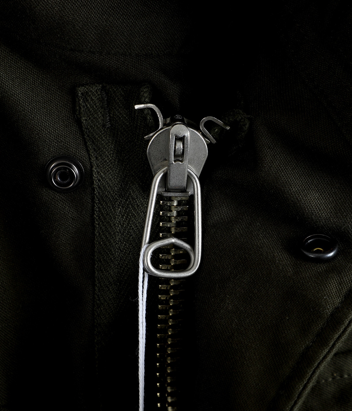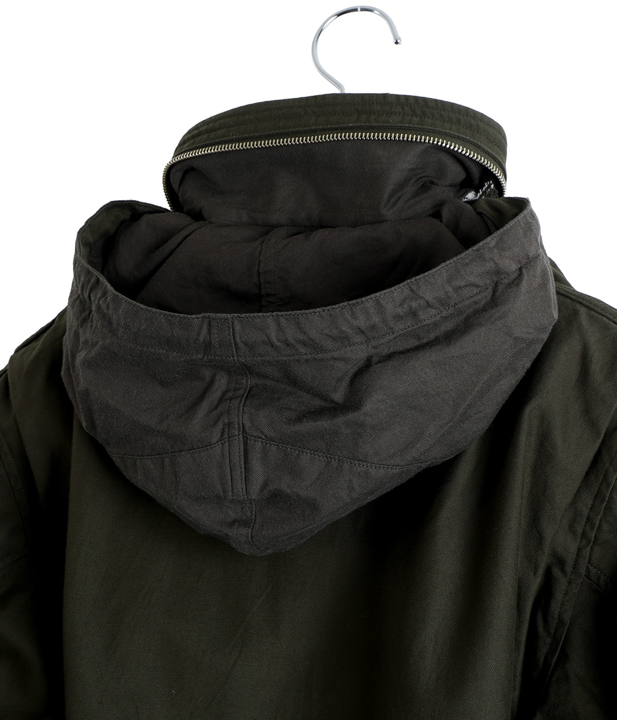 ・衿部分のジッパー内にフードを収納できる実用的なディテール