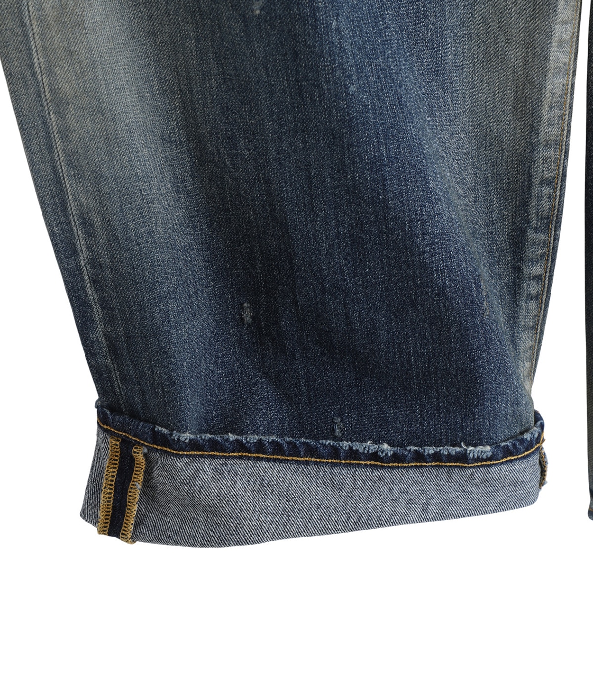 ・熟練職人が一本一本に手作業で施すダメージ加工で、小穴やアタリのバランスを緻密に調整