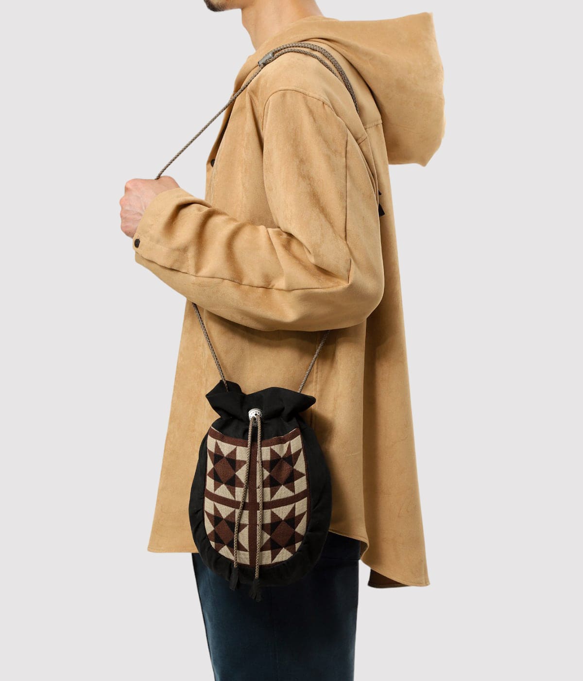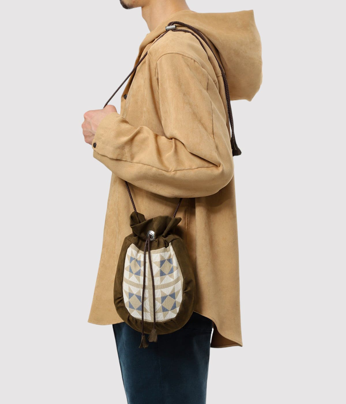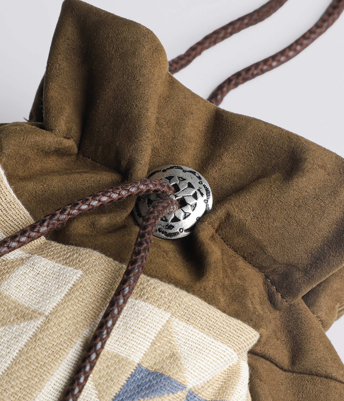 ・スウェーデンの北部、ラップランドの先住民族サーミの伝統的なトナカイ革を使用した巾着ポーチをモチーフにした、フェイクスウェード巾着バッグ
