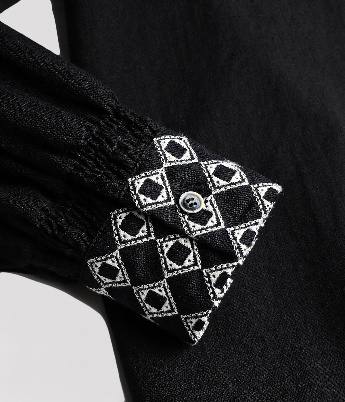 ・袖口に施された繊細な刺繍は、控えめながらも存在感があり、全体を引き締めつつもフォークロアな洗練されたアクセントをプラス