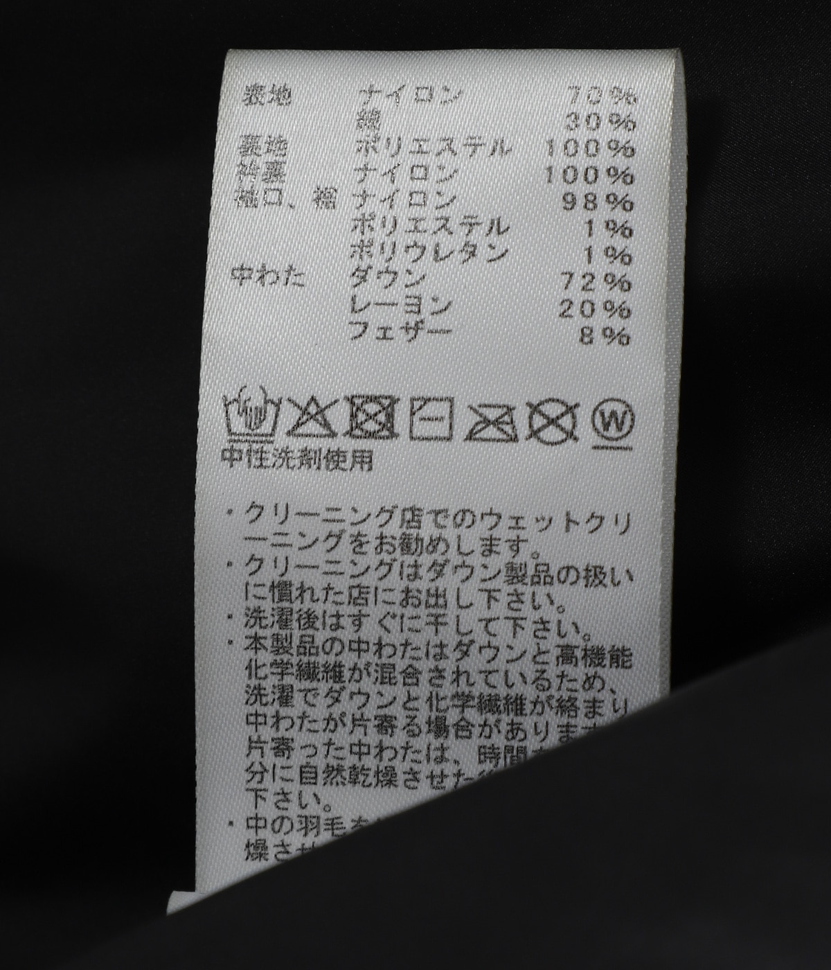 中わた:ダウン72%, レーヨン20%, フェザー8%