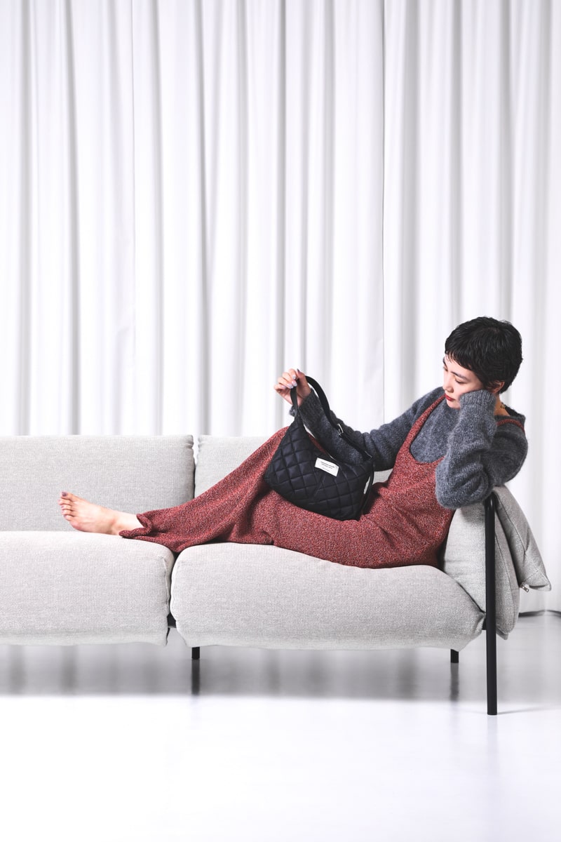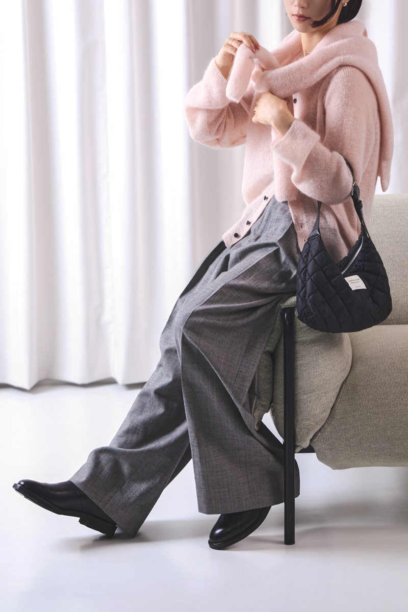 「キルティング生地にマットな光沢、持ち手のレザーに重厚感があって、どんなコーディネートもシックに仕上がるのが、私のお気に入りポイント。