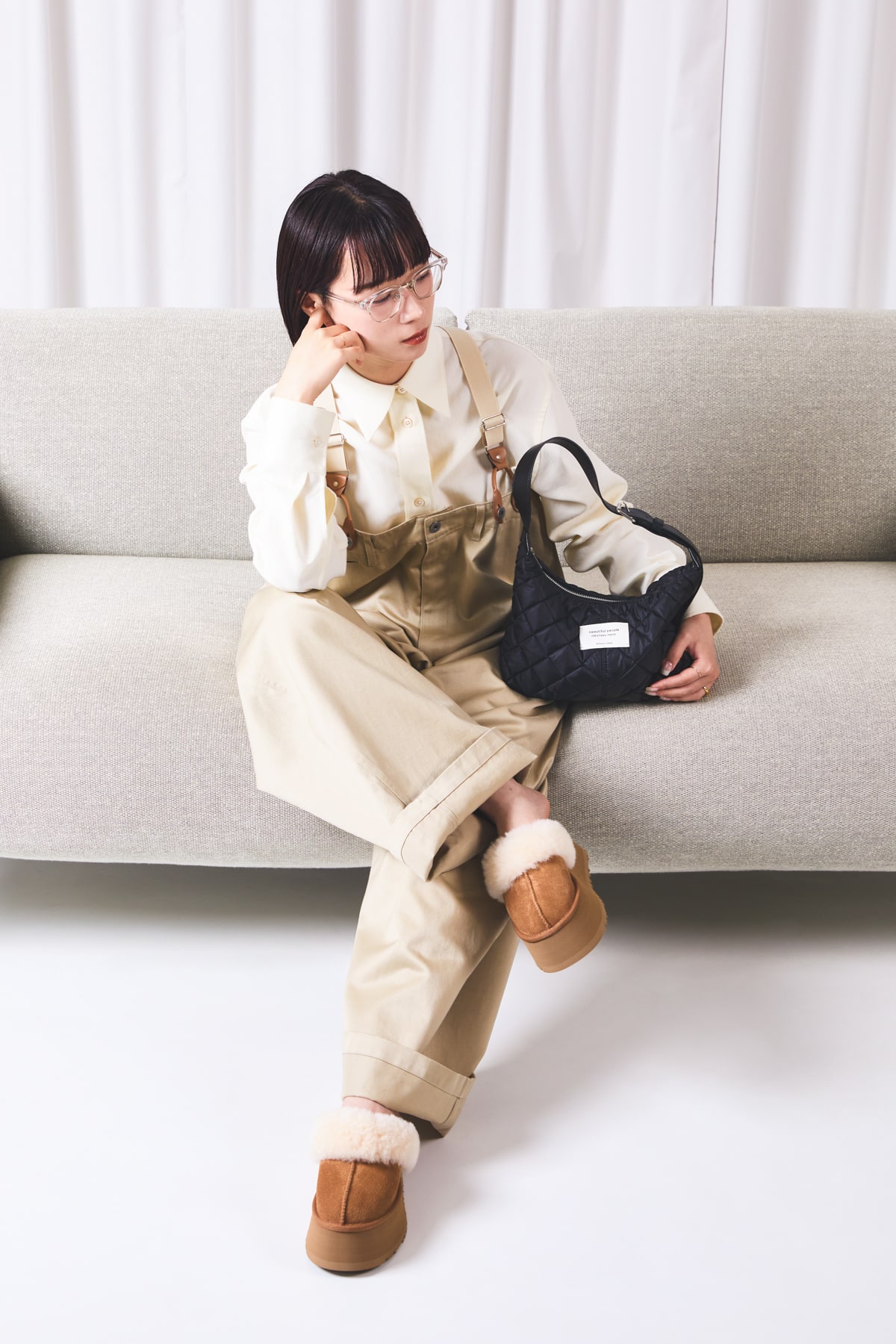”Boyish”なオーバーオールや”Girly”なピンクのニットなど、バランスが難しいアイテムでも、このバッグを持つだけで一気に大人っぽさがプラスされて、洗練された印象に。」