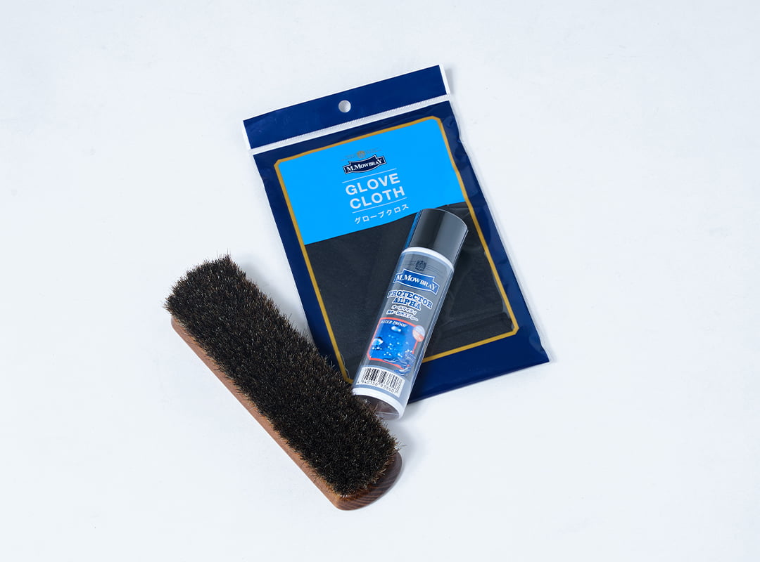 単品で ¥20,000(税込)以上のアイテムをご購入いただいたお客様に、購入特典として3種類のノベルティ(防水スプレー、ブラシ、仕上げクロス)の中からお好きな1点をプレゼントいたします。
